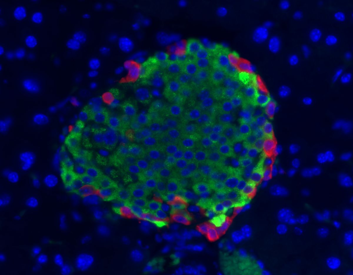 Figure 1. Immunoflourecense staining of a mouse Islet of Langerhans. PP is red, insulin green, and nuclei stained with DAPI blue. Image provided by Ernesto Bernal-Mizrachi of the University of Michigan.