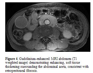 The most common site of extra-pancreatic involvement is the biliary tree presenting with asymptomatic liver test abnormalities or jaundice (23). On imaging, biliary involvement commonly appears as multifocal biliary strictures similar to primary sclerosing cholangitis. On CT or MR, the strictured bile duct commonly appears as diffuse or focal thickening of the wall. Rarely, it may form a mass which mimics cholangiocarcinoma. The kidneys are also commonly involved (25). On CT or MR, renal lesions are commonly bilateral and multiple, predominantly involving renal cortex (Figure 3). Renal parenchymal lesions can be classified as small peripheral cortical nodules, round or wedge-shaped lesions, and diffuse patchy involvement. Renal lesions may present as a large solitary mass which mimics primary renal neoplasm. Retroperitoneal fibrosis is seen in 10% of cases (Figure 4).